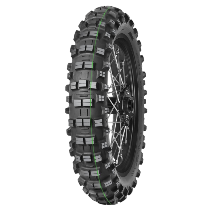 Anvelopa Mitas Terra Force-EF Super Light 140/80-18 70R TT (tube type) este anvelopa spate de performanta inalta, dedicata competitiilor enduro FIM si conditiilor extreme de teren tehnic, moale pana la mediu-umed, cu accent pe aderenta exceptionala, stabilitate si manevrabilitate in sectiuni lente si slippery. Versiunea Super Light (identificata prin banda verde caracteristica) combina o carcasa ultra-usoara si moale cu un compus gummy special, oferind flexibilitate maxima, greutate redusa si grip superior pe suprafete cu noroi, radacini, pietre umede si pamant moale. Knob-urile scurte respecta regulile stricte FIM pentru competitie, asigurand footprint larg si curatare rapida, fiind ideala pentru rideri profesionisti in Hard Enduro si EnduroGP unde aderenta pe umed este critica.
